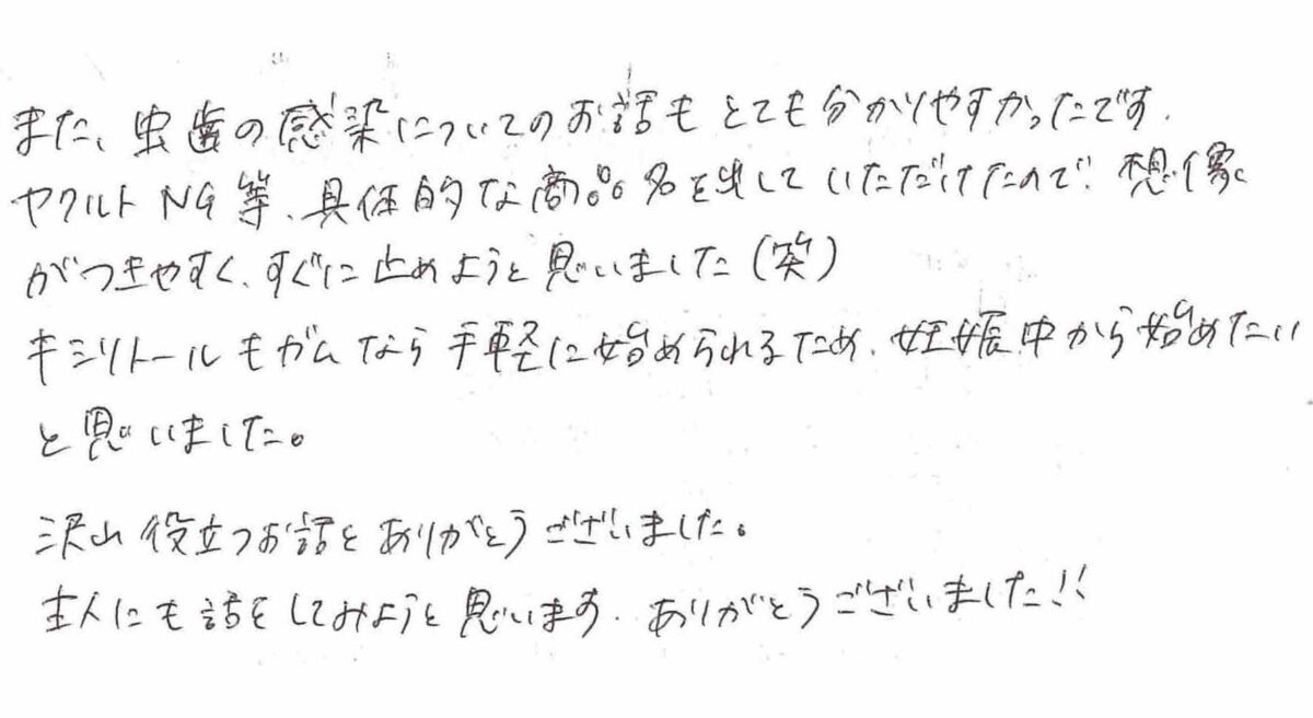 成長の過程での変化や疑問、思ったことなど、先生や歯科衛生士さんにその都度、丁寧にお話をいただけて、安心してお願いができました。